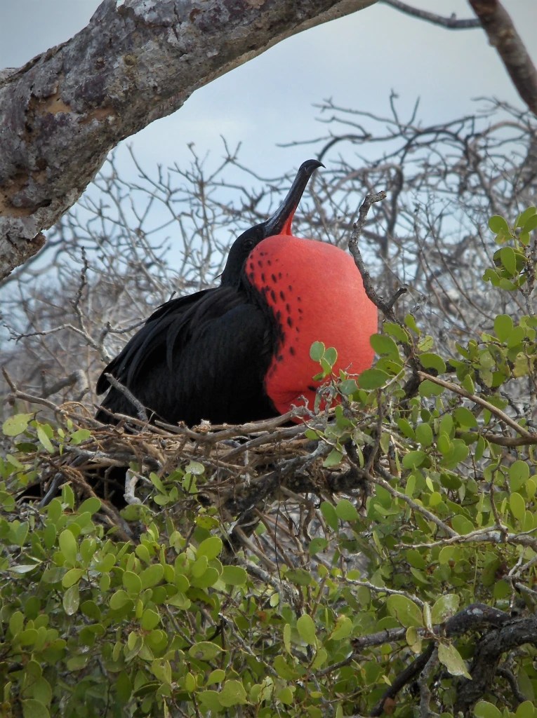 Both within and outside the frames [my husband] Jim created each time he sparingly clicked his camera’s shutter, there was love. This was not anthropomorphism–although the scene as female frigates gathered around a scarlet-throated male echoed what I understand to be the premise of a reality show involving the distribution of a limited number of roses.